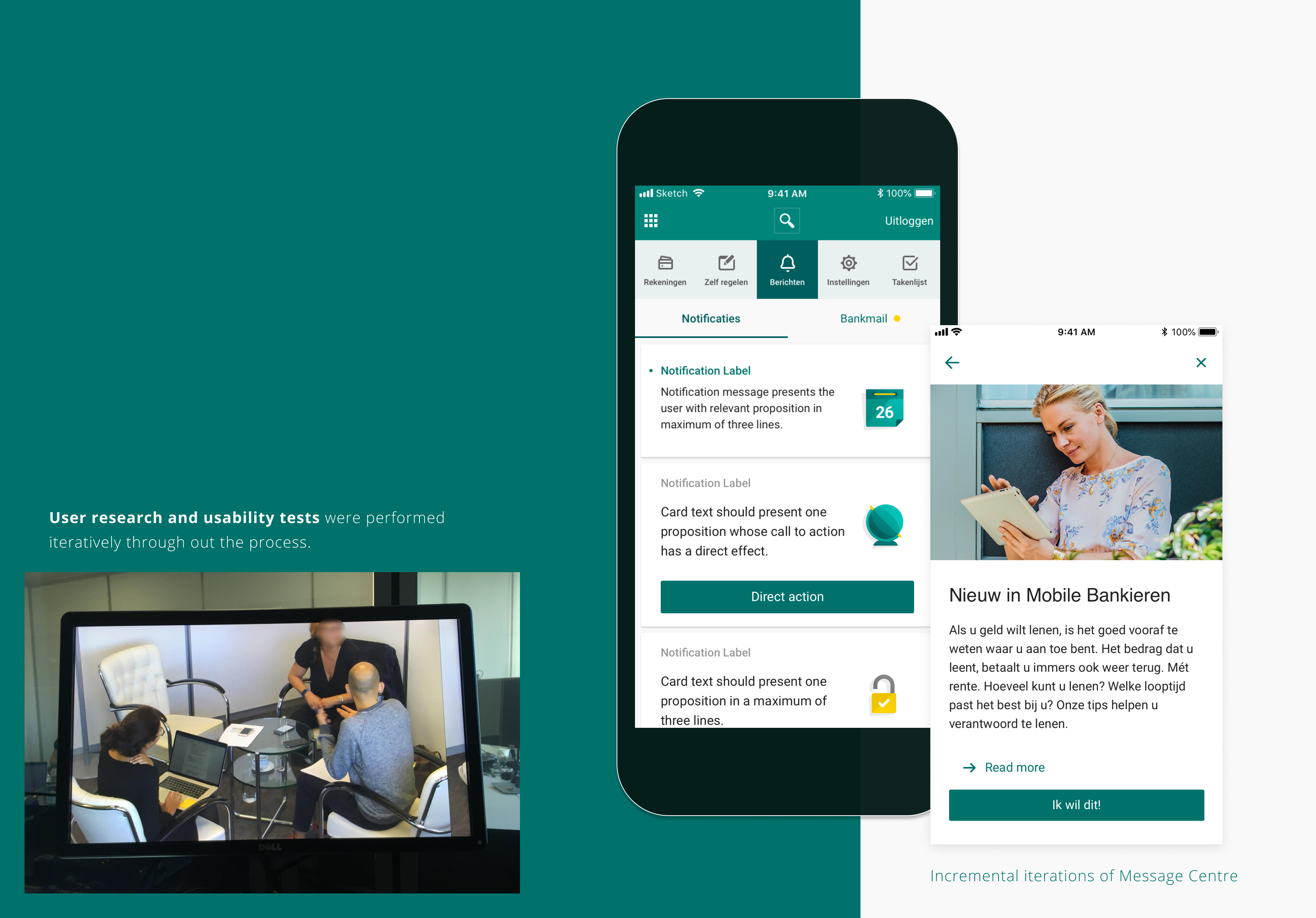 An in-app message centre was designed as a framework to replace legacy communication channels, which could feed and prioritise messaging from multiple departments of the bank.