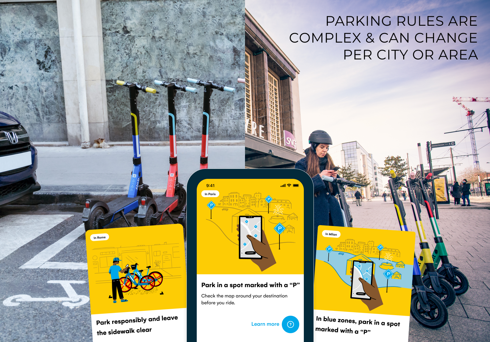 Parking rules for shared micro-mobility vehicles are complex and not self-evident. They are usually determined by the city government and can, in some cases, dramatically change from one area to another.
